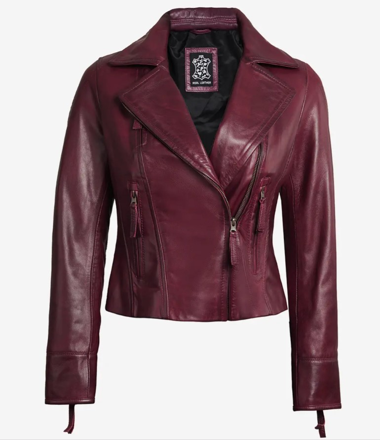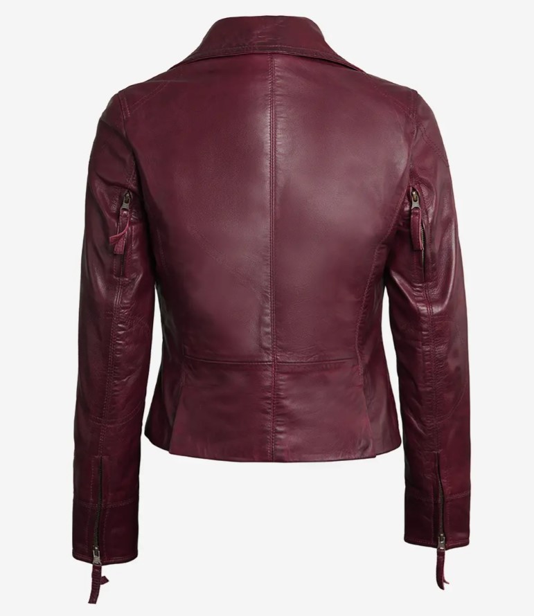 Ramsey Women’s Maroon Asymmetrical Waxed Biker Leather Jacket